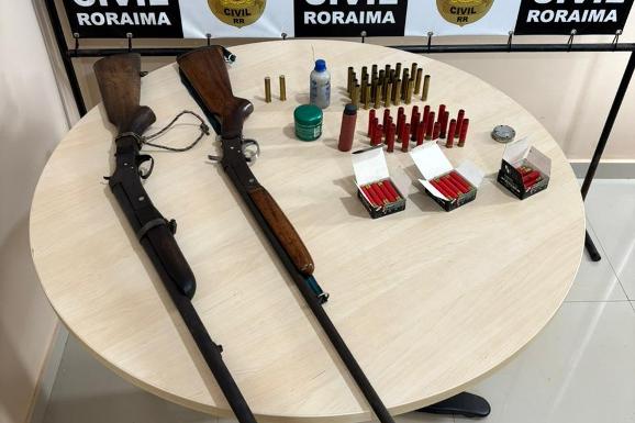 Durante o cumprimento da ordem judicial, os policiais encontraram, no imóvel onde o acusado residia, duas espingardas, além de 28 munições intactas e 58 cartuchos deflagrados, resultando em sua prisão em flagrante.