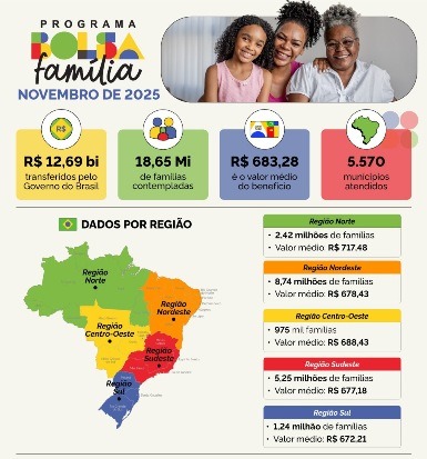 NACIONAL — O programa de transferência de renda do Governo do Brasil contempla neste mês 18,65 milhões de famílias (48,59 milhões de pessoas). O valor médio de repasse é de R$ 683,28, a partir de um investimento de R$ 12,69 bilhões.
