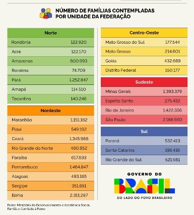 ESTADOS — Na divisão por unidades federativas, o maior número de contemplados em novembro está na Bahia. São 2,31 milhões de famílias beneficiárias no estado, a partir de um aporte de R$ 1,54 bilhão. São Paulo aparece na sequência, com 2,16 milhões de contemplados. Em outros seis estados há mais de um milhão de integrantes do programa: Pernambuco (1,46 milhão), Rio de Janeiro (1,42 milhão), Minas Gerais (1,39 milhão), Ceará (1,34 milhão), Pará (1,25 milhão) e Maranhão (1,15 milhão).