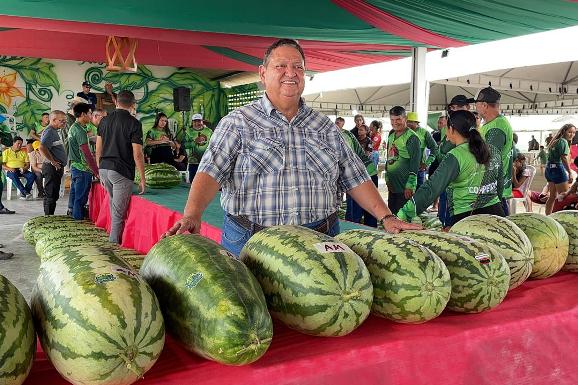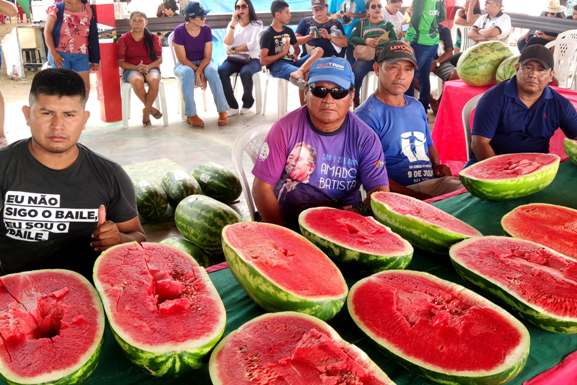 Feira da Agricultura Familiar, com expositores de melancia e outros produtos da produção local;
