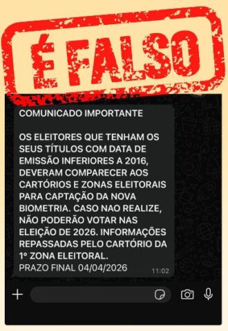 O TRE-RR também alerta que é falso o prazo em 4 de abril divulgado na mensagem. O prazo oficial do calendário eleitoral é 6 de maio de 2026 para tirar o primeiro título, transferir o domicílio ou atualizar dados cadastrais, inclusive com coleta biométrica.