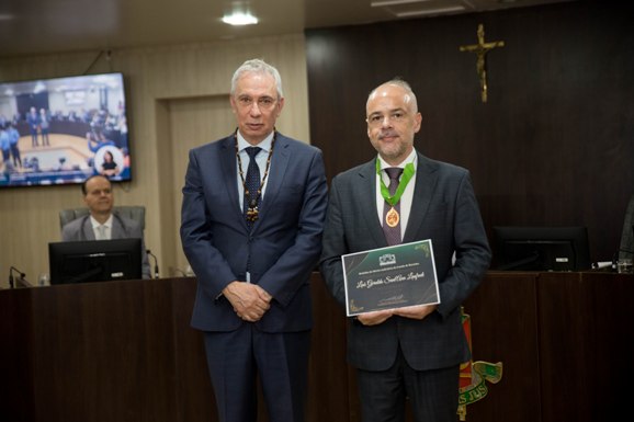 Durante a cerimônia, o Desembargador Luís Lanfredi recebeu a Medalha do Mérito Judiciário do Estado de Roraima, pelos relevantes serviços prestados ao Judiciário nacional, especialmente na defesa dos direitos das pessoas privadas de liberdade e na promoção de políticas de cidadania no sistema prisional brasileiro.