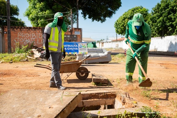 Nesta semana, os serviços chegaram à rua Ágata, no bairro Jóquei Clube, onde além da limpeza das bocas de lobo, a equipe também fez a roçagem e capina por conta do grande volume de lixo e mato acumulado no local — incluindo até um sofá velho, descartado de forma irregular por moradores.