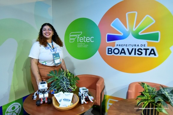 A representante da Agência Municipal de Empreendedorismo e Inovação (AME BV) e do Centro Municipal de Inovação (CMI), Danielly Peres, é a responsável por esclarecer aos visitantes o funcionamento das oficinas e capacitações da AME, além de tirar dúvidas sobre as aulas de robótica ao público infantil.