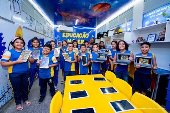 Um dos principais destaques da escola é o Espaço Maker, ambiente colorido e interativo, construído com recursos do Prêmio Gestão. O local reúne chromebooks, tablets e um laboratório de ciências, criando um espaço que estimula a criatividade, a experimentação e o aprendizado prático.