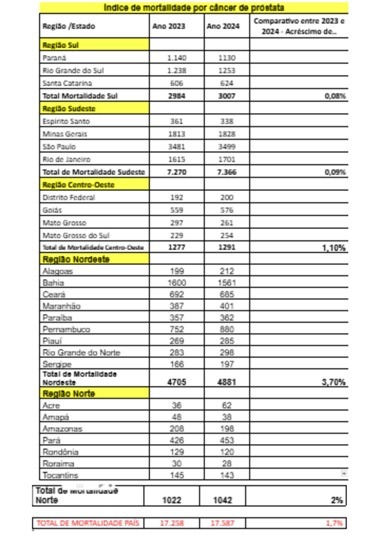 A maior incidência é esperada na região Sudeste (77,9 casos por 100 mil homens), seguida do Nordeste (73,3), Centro-Oeste (61,6), Sul (57,2) e Norte (28,4). No entanto, as taxas de mortalidade são maiores no Norte e Nordeste, demonstrando um diagnóstico mais tardio nessas regiões. Segundo dados do Instituto Nacional de Câncer (INCA), o Brasil registrou 17.258 óbitos por câncer de próstata em 2023 e 17.587 em 2024, representando um aumento de aproximadamente 2%. Roraima concentra 28 dos 1042 óbitos por câncer de próstata registrados na região Norte em 2024. A doença é a segunda principal causa de morte entre os homens, perdendo apenas para o câncer de pulmão. Confira, a seguir, a tabela por estado.