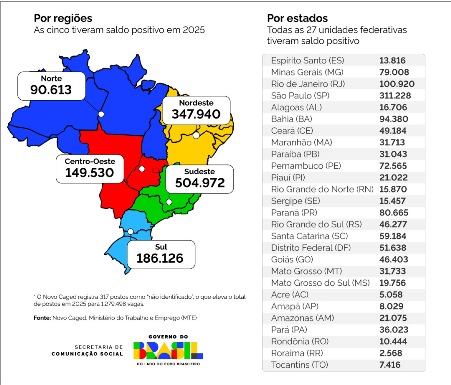 REGIÕES – O desempenho positivo foi observado nas cinco regiões do país e nas 27 Unidades da Federação, conforme o Novo Caged. A região com maior número de empregos gerados em 2025 foi a Sudeste, com saldo de 504,97 mil vagas ao longo do ano (+2,10%), seguida pela Nordeste, que registrou 347,94 mil (+4,38%), e pela Sul, que gerou 186,12 mil vagas (+2,16%). A região Centro-Oeste apresentou saldo positivo de 149,53 mil postos (+3,56%), enquanto na Norte foi de 90,61 mil (+3,81%).