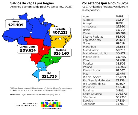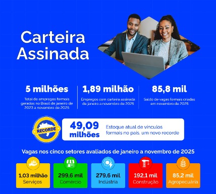 NACIONAL – O Brasil celebrou em dezembro uma cifra superlativa na geração de empregos com carteira assinada entre o início de 2023 e novembro de 2025, superando a marca de 5 milhões de novos vínculos formais criados no país. No período, foram preenchidas 5.028.124 postos. Em novembro do ano passado, o saldo ficou positivo em 85.864 postos de trabalho, resultado de 1.979.902 contratações e 1.894.038 desligamentos. Com isso, o país chegou a 49,09 milhões de vínculos formais ativos, o maior estoque registrado na série histórica do Novo Caged.