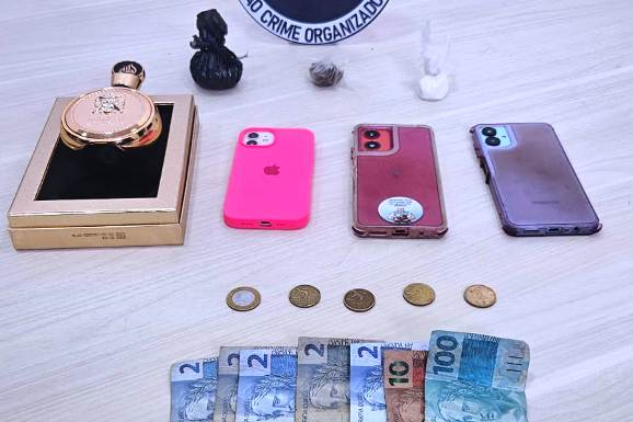 No interior do automóvel estavam duas mulheres e o suspeito. Durante a busca veicular, os agentes encontraram dois invólucros contendo substâncias análogas à maconha tipo “skunk” e à cocaína, além de três aparelhos celulares e um bilhete com anotações que indicam possível atividade de tráfico.