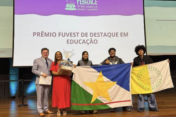 Maria Bernadete Barbosa Lima Oliveira recebeu medalha e certificado por figurar entre os 10 professores destaques; os estudantes orientados por ela também conquistaram lugar de honra na premiação.