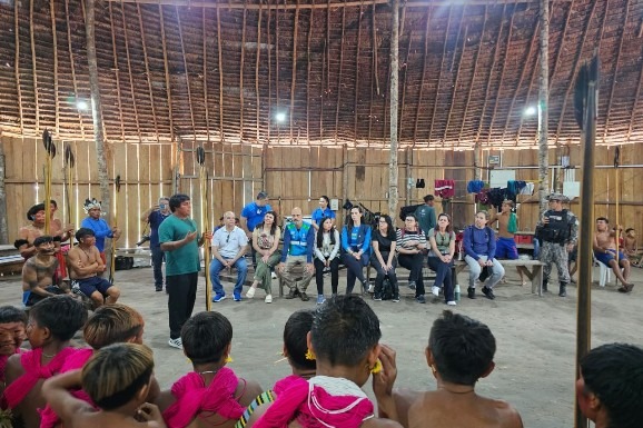 Comitiva reuniu-se com o líder Yanomami, Júnior Hekurari, e demais indígenas da região e conheceu as instalações do novo Centro de Referência em Saúde Indígena Yanomami e Yekuana.